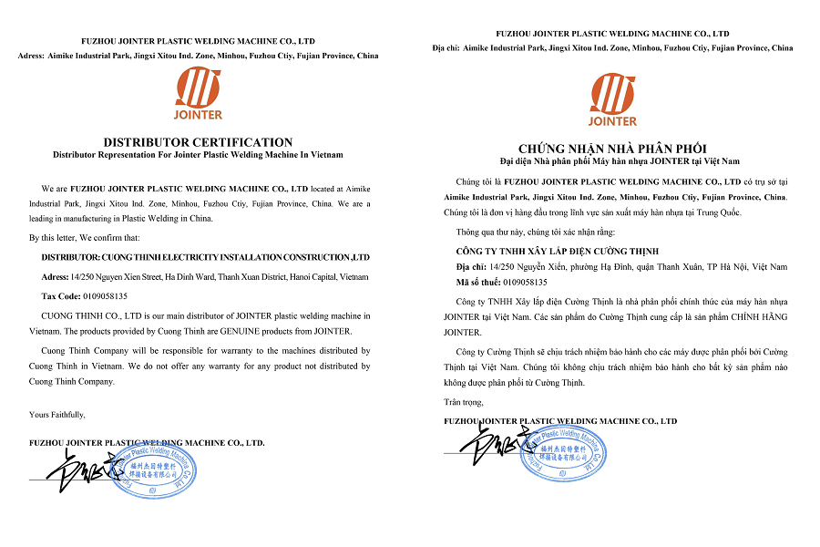 Hiện Cường Thịnh là đơn vị được uỷ quyền để PHÂN PHỐI ĐỘC QUYỀN MÁY HÀN BẠT JIT tại Việt Nam có sẵn chi nhánh tại Hà Nội và TP. Hồ Chí Minh. Đảm bảo hỗ trợ khách hàng nhanh nhất có thể khi máy gặp vấn đề về kỹ thuật.